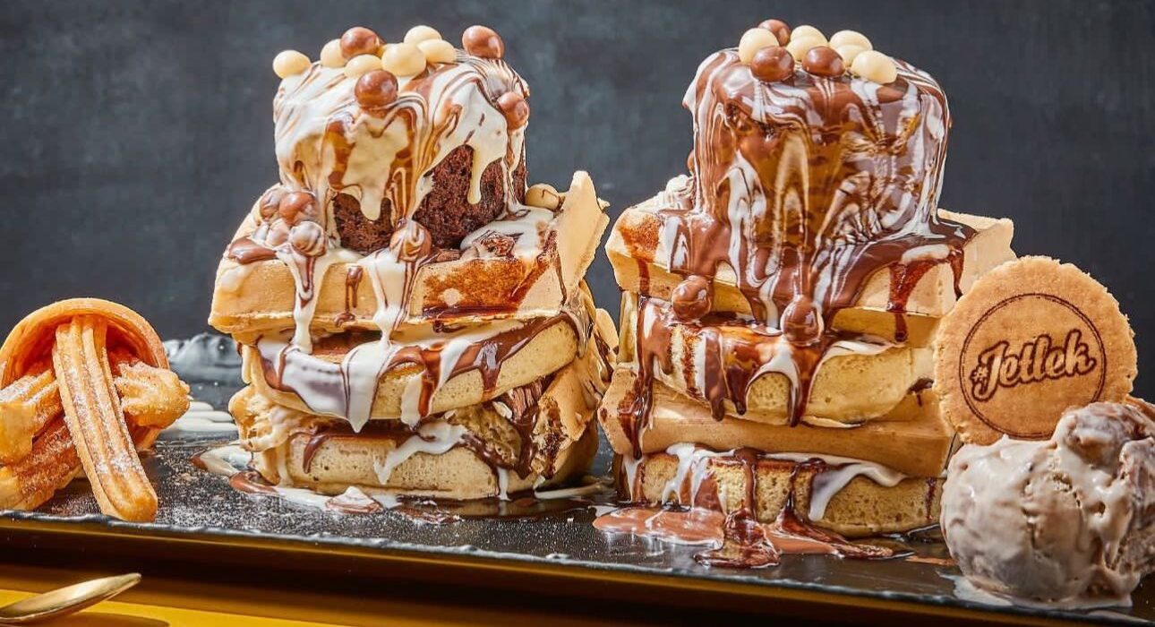 ארבע יחידות פנקייק, 2 יחידות וופל ושני סופלה בציפוי שוקולד חום אגוזים ולבן וחצי ליטר יוגורט + 4 תוספות